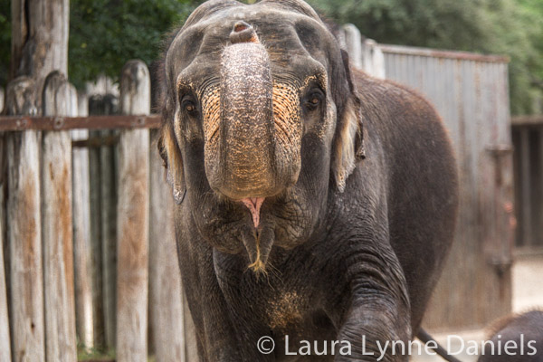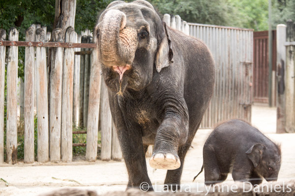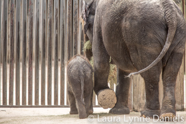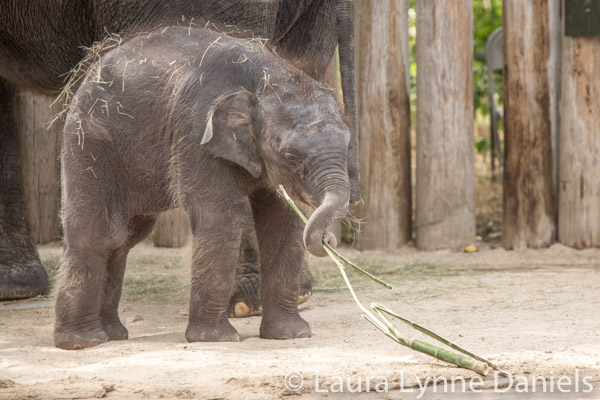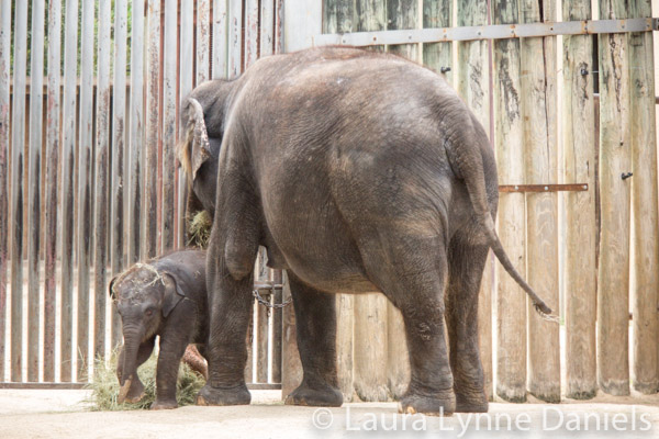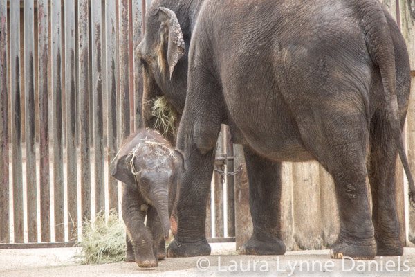 But no Bowie… I got to the elephants this morning before they were out. Kami or Kelly weren’t there, but Mike was (today was my first time talking with Mike, but Kami introduced me to him yesterday). We were waiting for the elephants to come out, then the Zookeepers came out to make sure the food was in the right place and that everything was set for them, then about 5 mins later the gates opened and out came Rasha and Belle… but oh, what an entrance! Today Rasha, the zookeepers and Belle following, walked straight out to the visitors and Rasha smiled and gave a big Hi-5 to us! It was very cute, and of course I got it with my camera. Then Rasha and Belle went over to their hay, Rasha grabbed a big bunch with her trunk and she took it where she could eat with a little more privacy. I found out today that Belle is already about 470 lbs… she’s on the big side. Belle was lively today, she did a little bit of running, today was her first day of trying to eat some hay (at least it was the first I’ve seen it and Mike said the same thing)… she grabbed a big bunch of it with her trunk, but I think more fell on the ground than actually went in her mouth and she was trying to dig a hole and play and eat some mud. I also found out today that there is a one year old giraffe, her (I think it’s a her) name is Tatu. She is smaller than the adults, but unilike the elephants and Greater One Horned Rhino’s, giraffes grow tall quickly. She’s already 10′ tall. Click here for more information about Tatu’s birth.