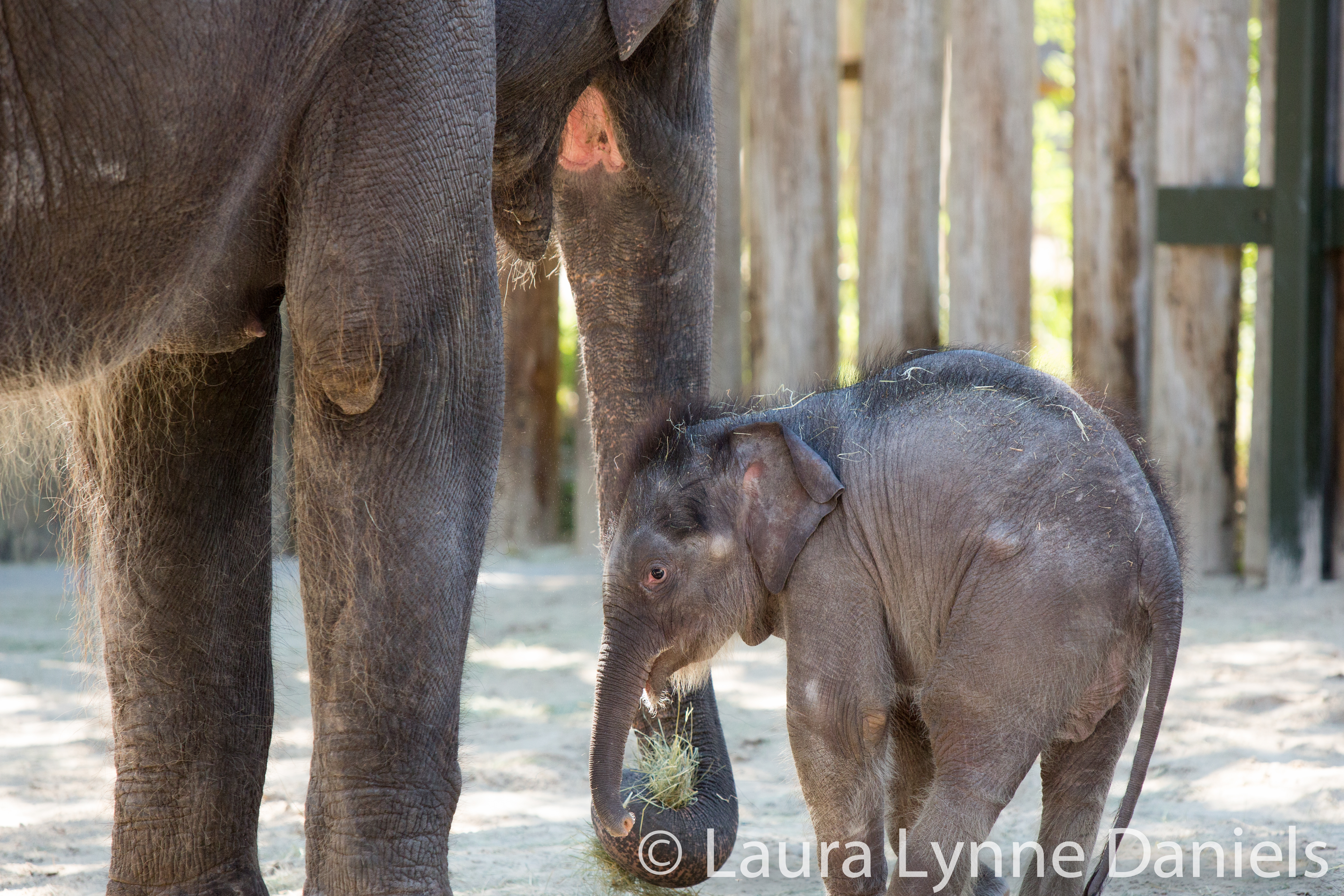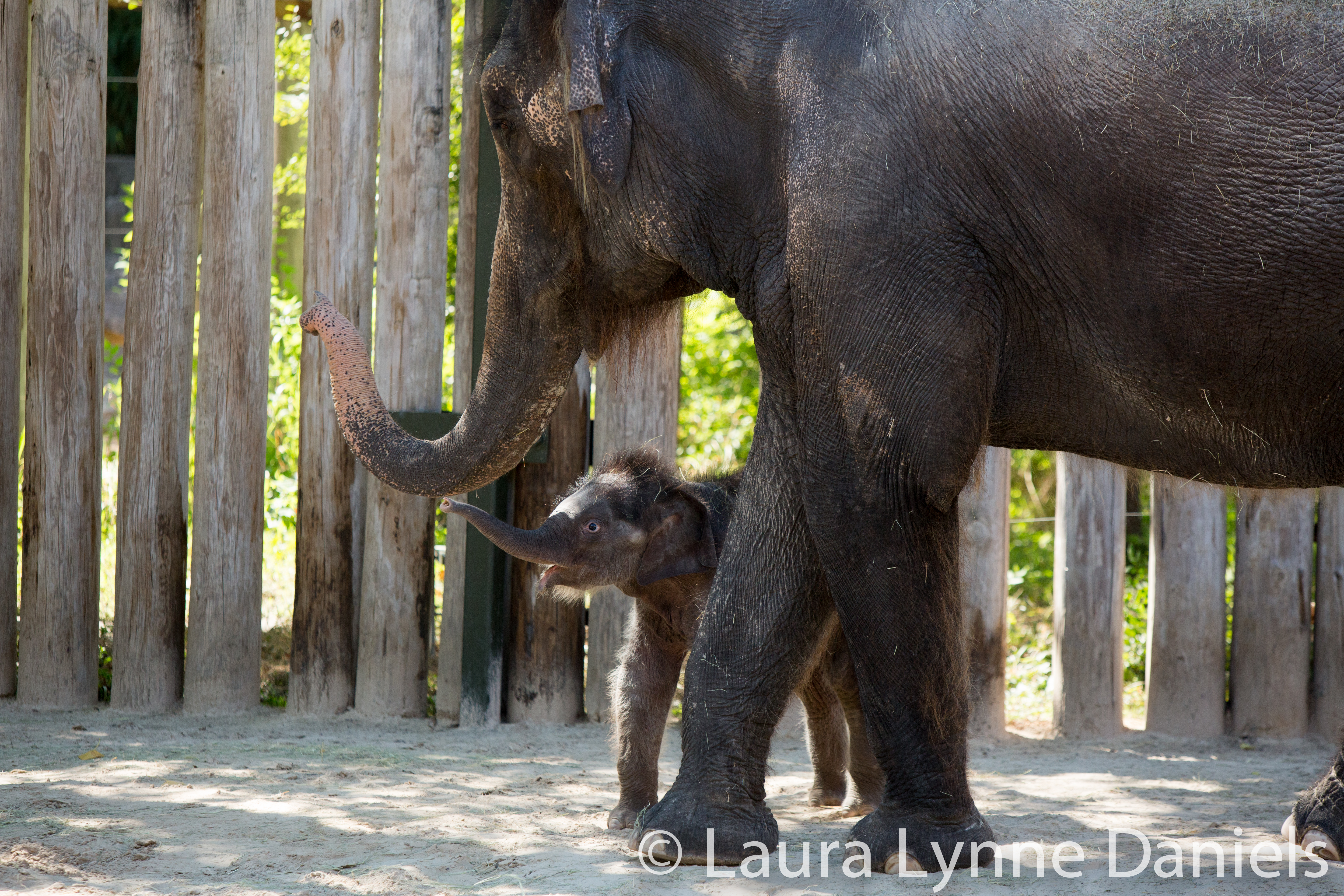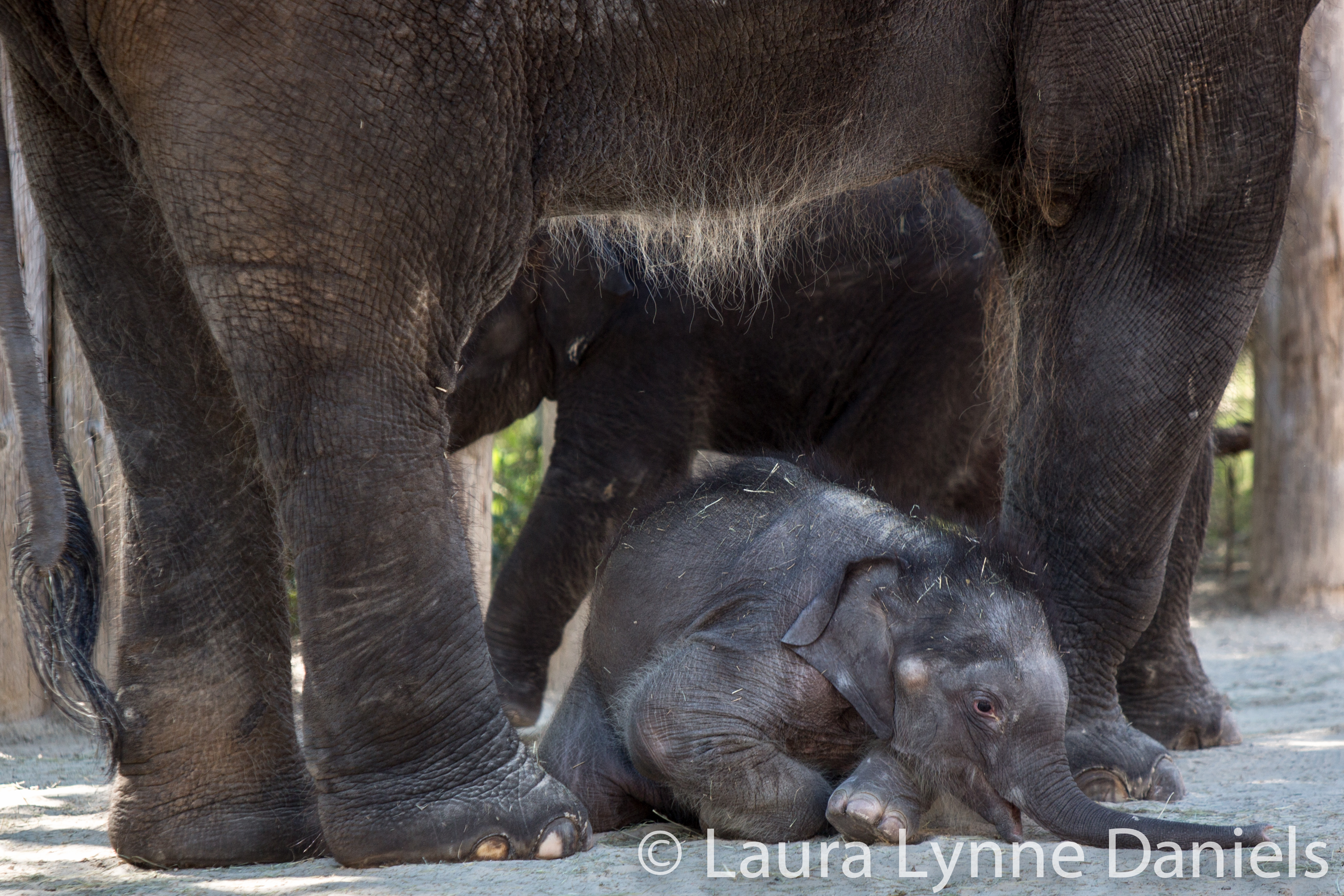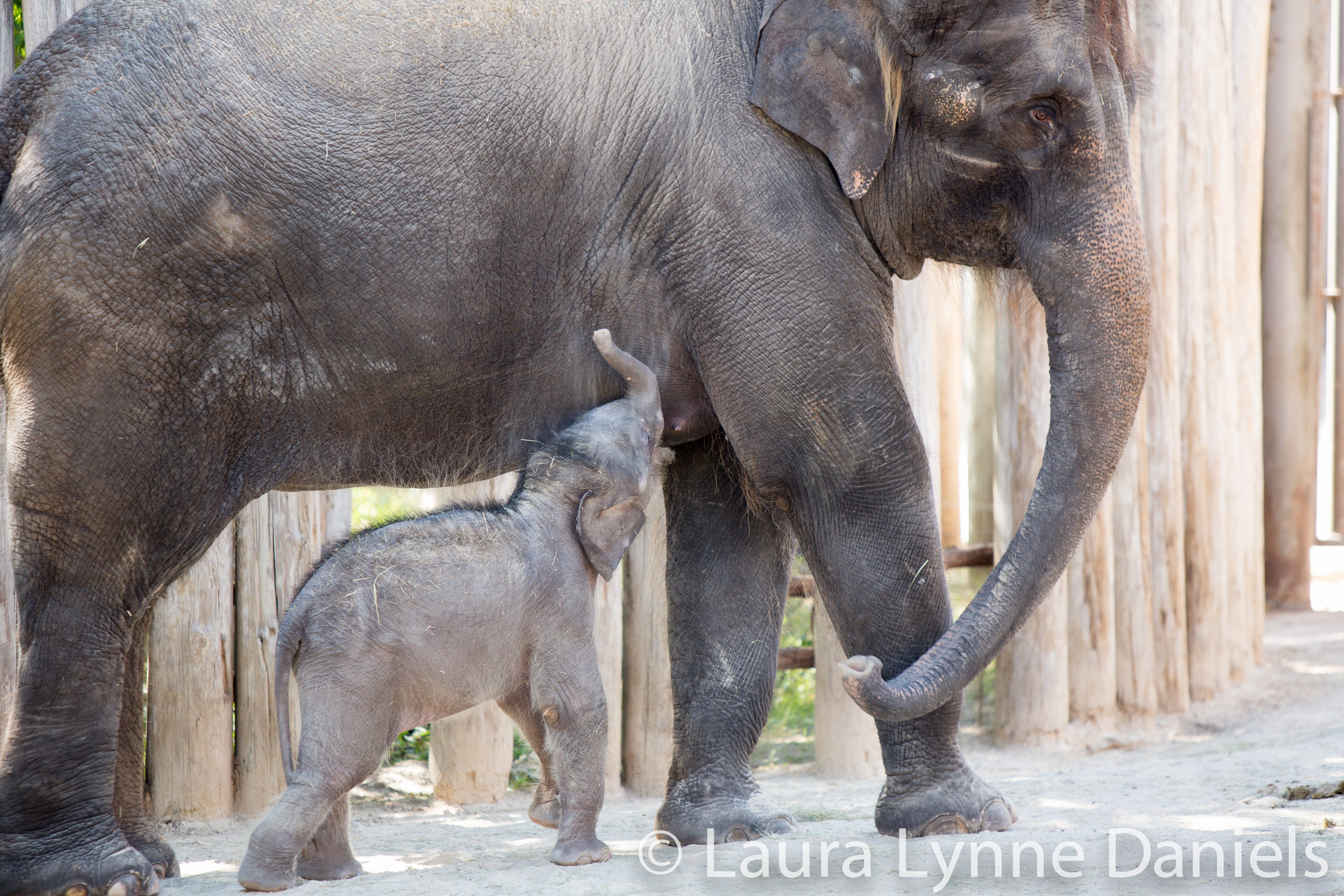 I wasn’t planning on going to the zoo today, but I finished my work early and thought that since I probably won’t be able to go tomorrow or over the weekend, then I better go today. It was another day with both babies, their moms and Angel. Angel is an extended family Aunt to Belle and Bowie. Angel is the largest of all of the three adult females. She has a lot of hair and very long ear hair… Her back is sloped. Bluebonnet has a humped back, she seems to be larger to me than Rasha, her mom. Bluebonnet is 14 and I just realized today that she was only 12 when she got pregnant with Bowie…that sounds so young, but for elephants, it’s ok. Rasha, I think, is about 40… I need to check on that. Bowie was quiet today… no noises at all. I got there around 10:30 and stayed until about 11:45… it’s so hard to walk away because they are all so interesting and cute to watch. Belle was very active today and running around a lot. She and Bowie were playing and pushing each other. By the time I left, Bowie seemed a bit tired. He was out two days ago and again today, so this may be a lot of activity for him. He stopped to lay down twice and once he rolled on his back, the way my dogs do when they want a belly rub. Here are some videos and photos from today. Both Belle and Bowie spent some time nursing and Bowie and his mom (Bluebonnet) locked trunks…. I didn’t get into the other parts of the zoo because it was very crowded, I did stop by to see Asha and Shanti (Greater One Horned Rhino’s… mom and baby) though… they were snuggled together as they normally do.