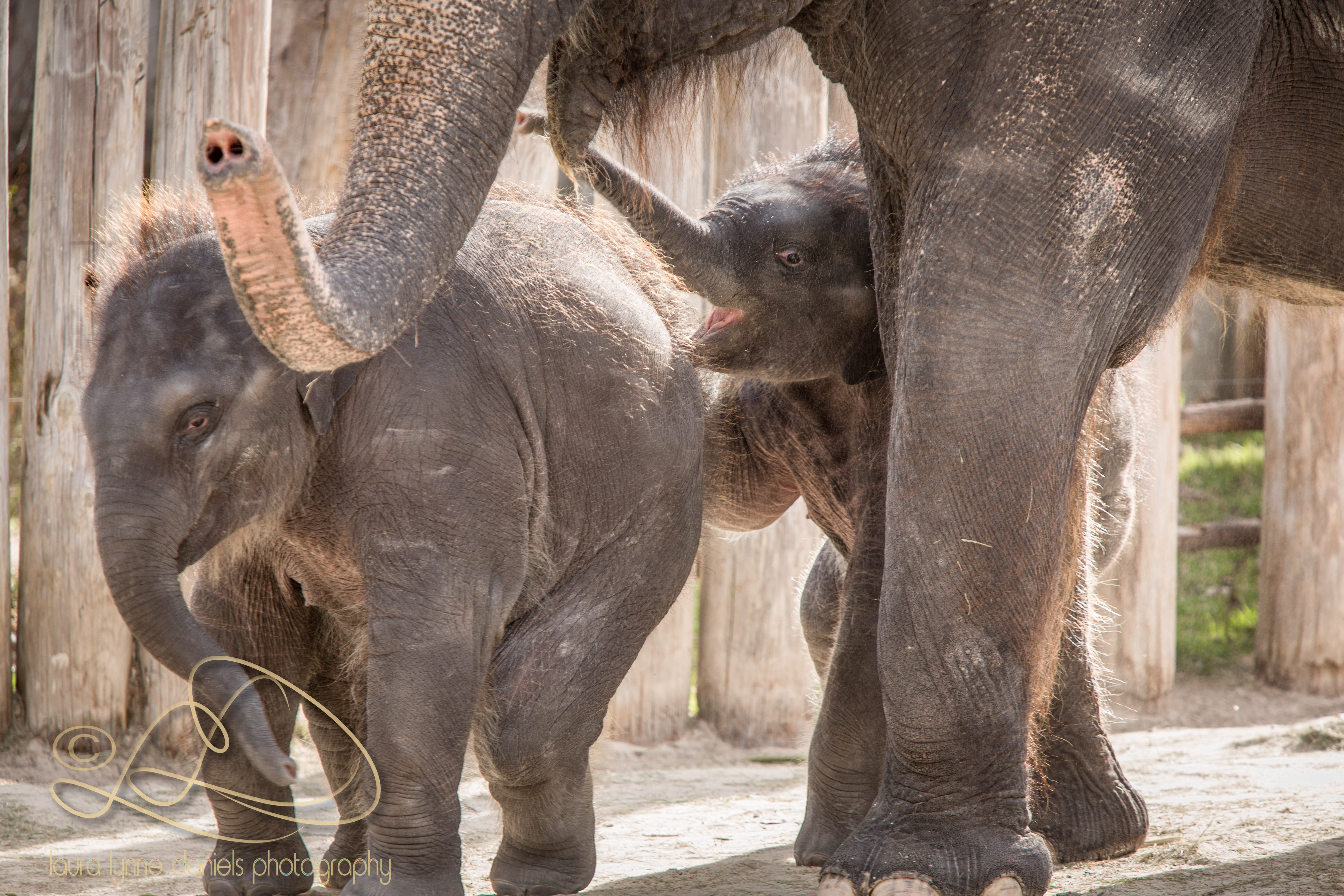 Belle on the left and Bowie playing with Bluebonnet (Bowie’s mom) looking after them