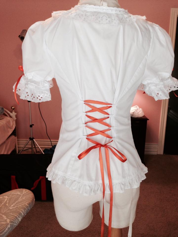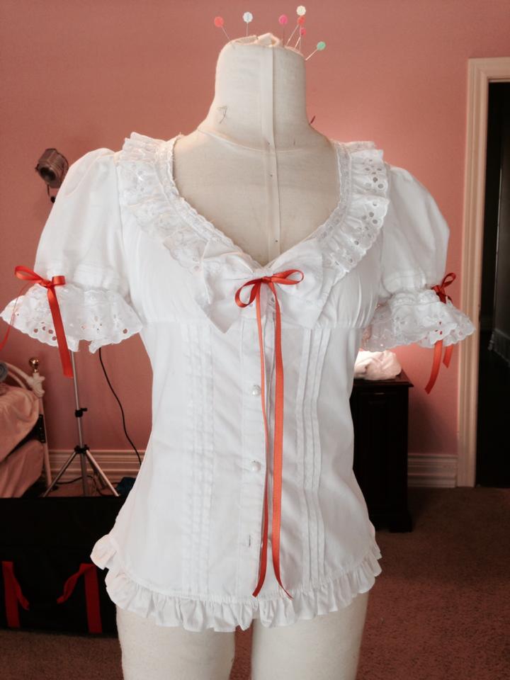 So….  weeks later now…  we finished our costumes (although it came right down to the wire, we were still sewing only an hour before the Mayfest Performance…   our Chulapa-like blouses came from China (they are actually Lolita blouses) and we modified them with eyelet and bows.