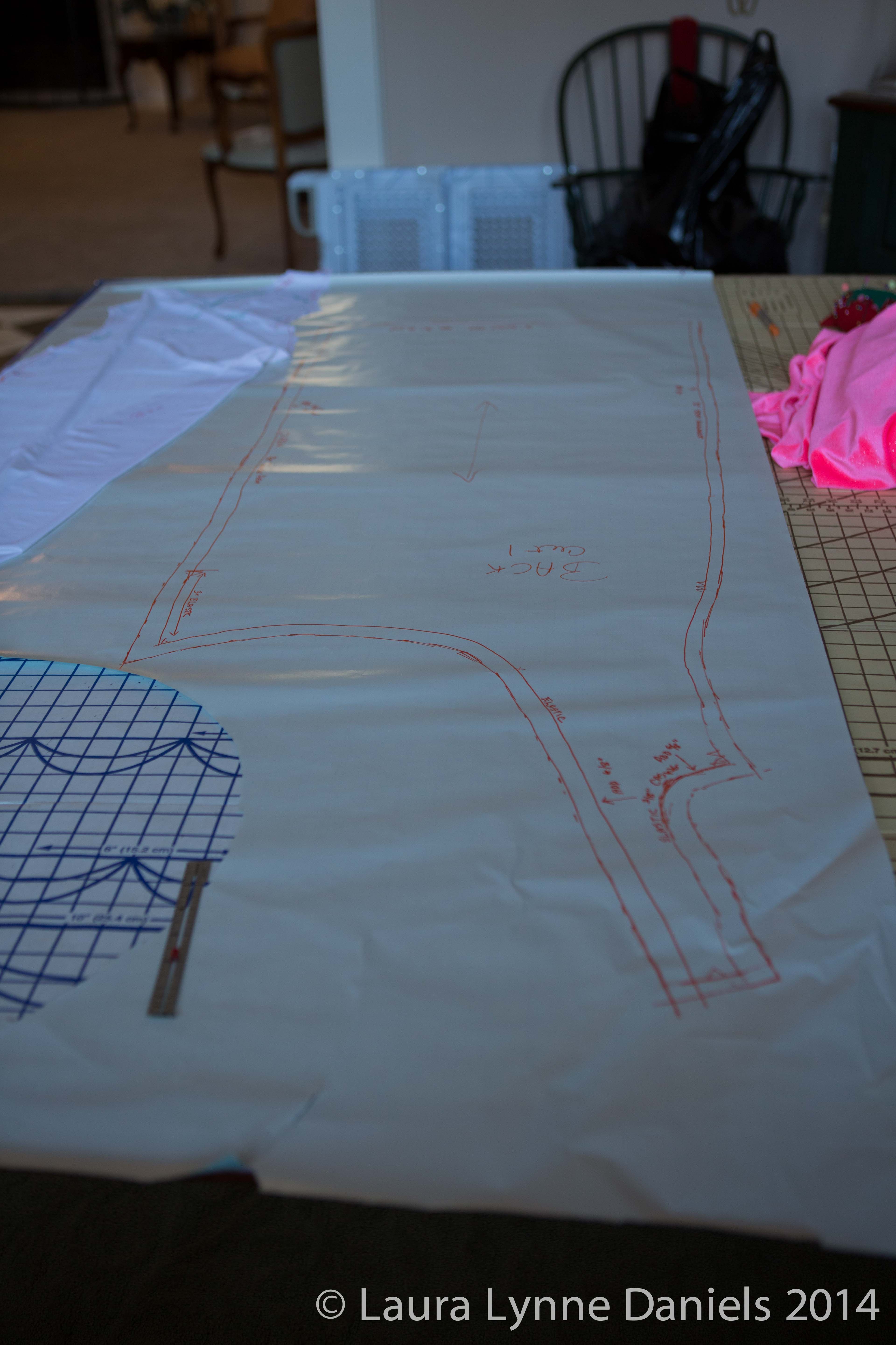 I then started draping some old white spandex on my dress form to start making the pattern. I pinned it and marked it to get ready to cut it and then to make the real pattern from it.