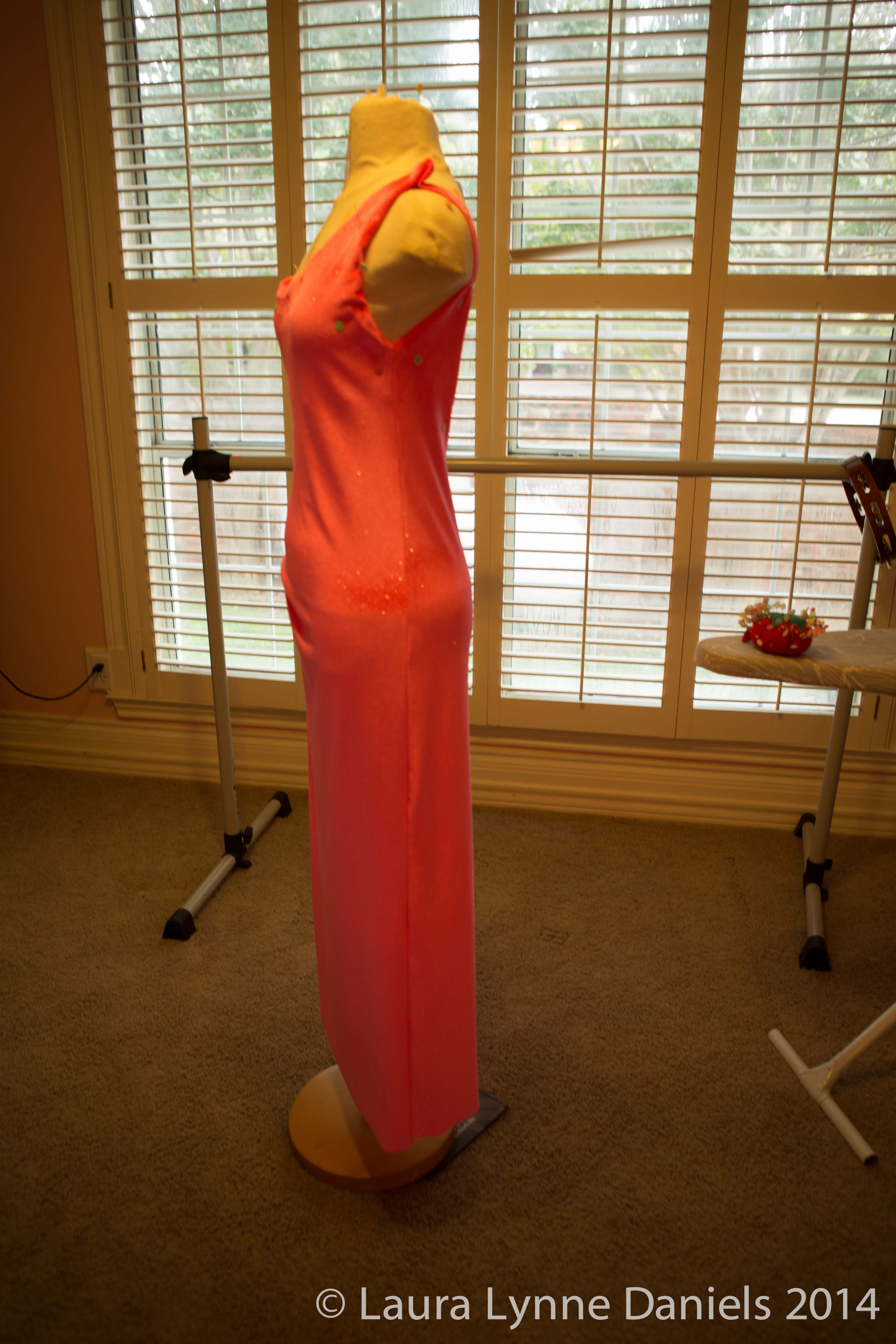 Yesterday I wore the dress during my lesson/rehearsal to see how it worked with my choreography… Under the studio lights, the color was a bit brighter than it was in my house…but such a pretty color!