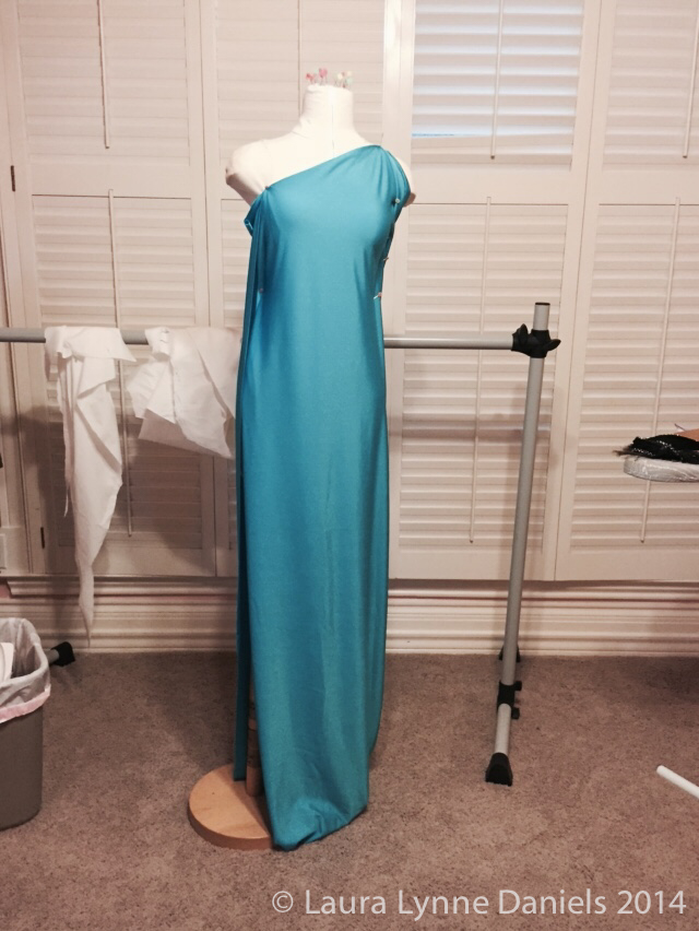So I decided to make my own design and dress. I do sew costumes, so I knew I should be able to handle this project. I had some turquoise lycra left over from another project I was working on so I draped it on my dress form to see if I had enough fabric and to see if I liked it. I liked the look… although everything I do seems to be turquoise. I wanted white, but I already have this fabric, so I might as well use it.