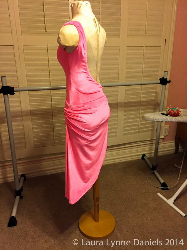After cutting out the fabric, I sewed it together, put it back on the dress form, made a few adjustments and more sewing. Then I tried it on… Even though the dress form is made to my exact measurements, there were a few more adjustments to make. So, back to the sewing machine to adjust it. Then I tried it on again. It was ok, I wasn’t really crazy about the design and the long dress. It looked nice on the dress form, but not really overly flattering on me, it was just a bit boring. I thought that I would like to ruche the waist area and the backside of it. I’ve never done ruching so I needed to do some research on that.